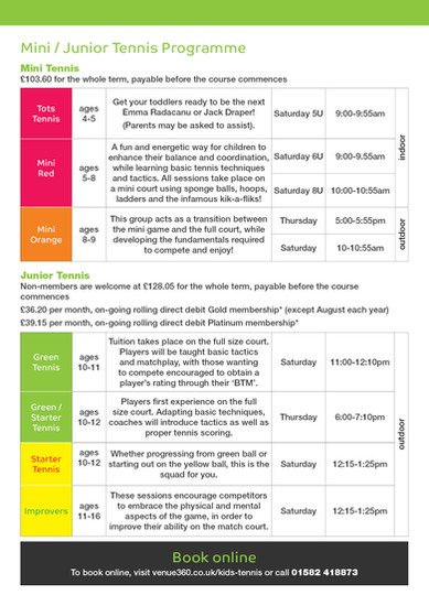 You can now book online, just click below, search for kids tennis and all courses available will appear for you to book.